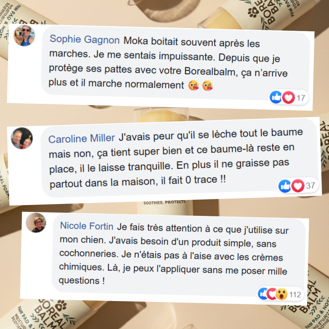 Passionnée par le bien-être animal, j’ai voulu créer un soin naturel, doux et facile à utiliser, pensé pour le quotidien réel des propriétaires de chiens. Un produit que l’on peut appliquer en toute confiance, sans stress, et qui s’intègre naturellement à la routine. Inspiré par notre climat canadien et par l’amour que nous portons à nos animaux,