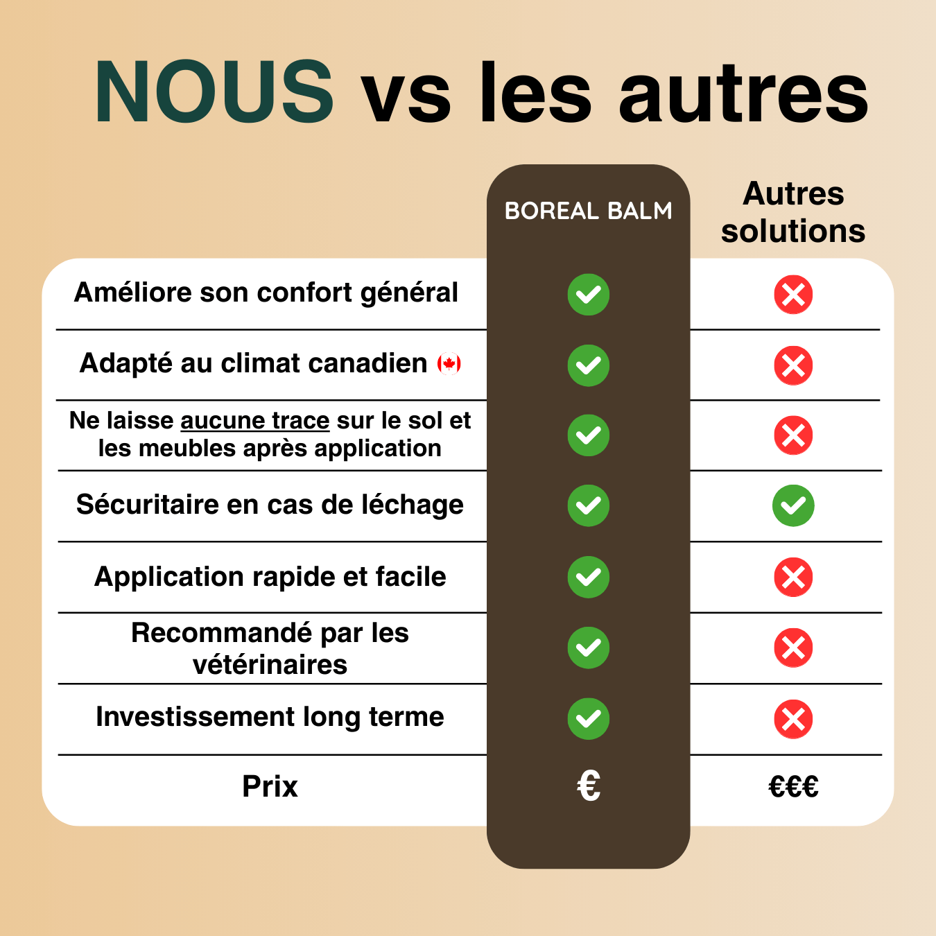Toutes les solutions ne se valent pas. Boreal Balm est pensé pour le quotidien réel des chiens et de leurs propriétaires, avec une formule adaptée au climat canadien et une application simple.